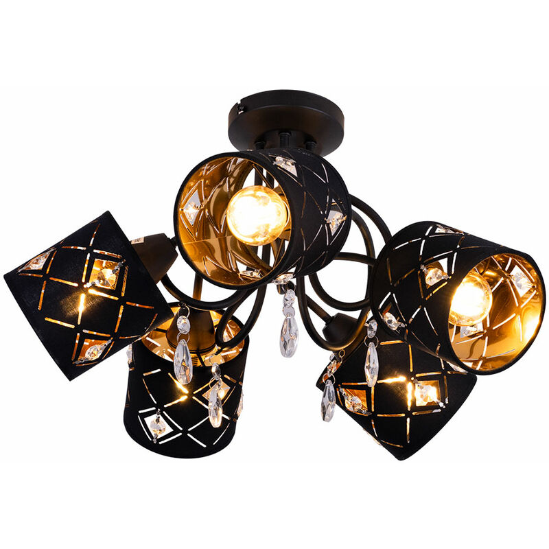 Descrizione Questa lampada da soffitto (ø 46 cm) è un'aggiunta elegante ai tuoi interni. La plafoniera da 27,5 cm ha cinque aste intrecciate in metallo nero opaco, ciascuna con un paralume in tessuto nero con un motivo elegante. Puoi equipaggiarli con lampadine E14 a tua scelta, che ti danno l'opportunità di determinare il colore della luce e la luminosità in base alle tue idee. Inoltre, la plafoniera è decorata con bellissimi cristalli acrilici, che danno il tocco finale al suo aspetto. Puoi completare il quadro generale delle tue quattro pareti con altri articoli della serie. Le lampadine non sono incluse nella fornitura. Particolare lampada • Tipo di lampada: plafoniera • Materiale: metallo, nero • Paralume: tessuto, cristalli acrilici trasparenti • Colore paralume: nero, oro • Grado di protezione: IP20 • Tende di cristallo • Diametro x altezza in cm: 46 x 27,5 • Prese: 5x E14 • Lampadina inclusa: n • Potenza lampada: max 5x 25 watt • Alimentazione: 230V, 50Hz