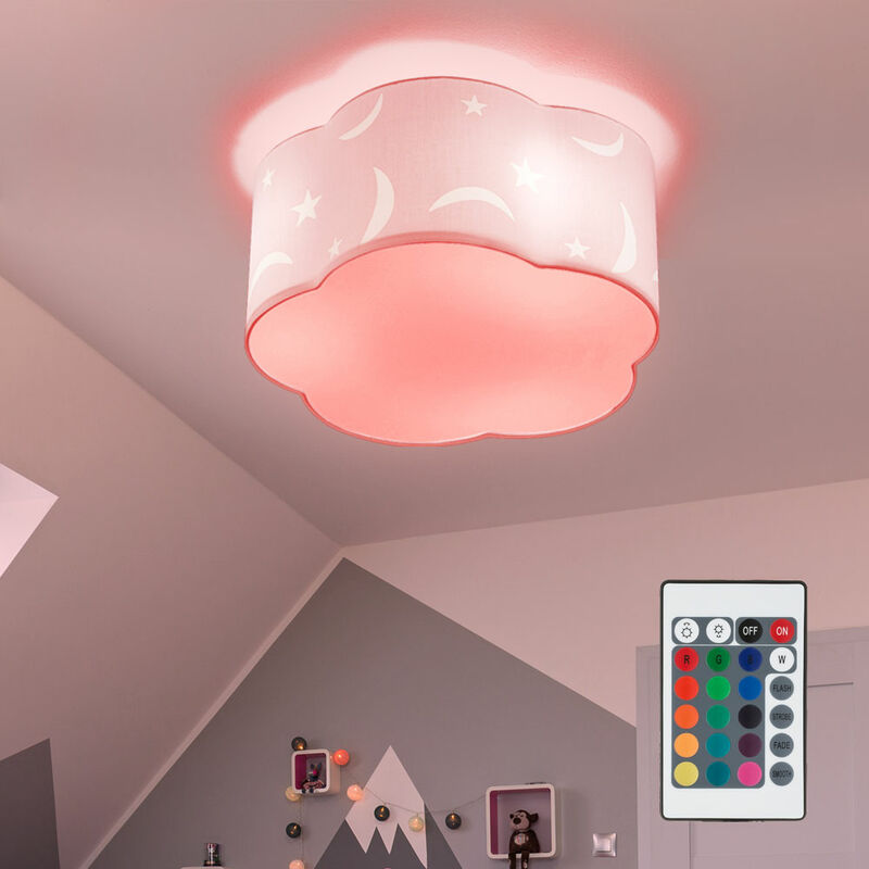 Descrizione Porta un'atmosfera accogliente nella stanza dei bambini. La plafoniera irradia intimità da un lato e fornisce una luce piacevole e priva di abbagliamento per giocare, dipingere o fare lavori manuali dall'altro. La plafoniera ha la forma di una nuvola ed è decorata con un mix di stelle e lune, che diventano un magico richiamo visivo quando la luce è accesa. La plafoniera ha un diametro di 40 cm e si adatta a quasi tutte le dimensioni della stanza. È progettato in un semplice rosa pastello e si adatta a tutte le combinazioni di colori nella stanza dei bambini. Con il telecomando incluso, puoi accendere e spegnere comodamente le luci dal divano. Grazie a 16 colori diversi, decidi se vuoi aumentare il fattore coccole nella tua camera da letto, ravvivare le tue stanze individualmente o dare al tuo soggiorno una porzione di stile in più. È altrettanto facile decidere tra un colore di luce permanente o un programma di illuminazione automatico. La funzione di memoria ricorda