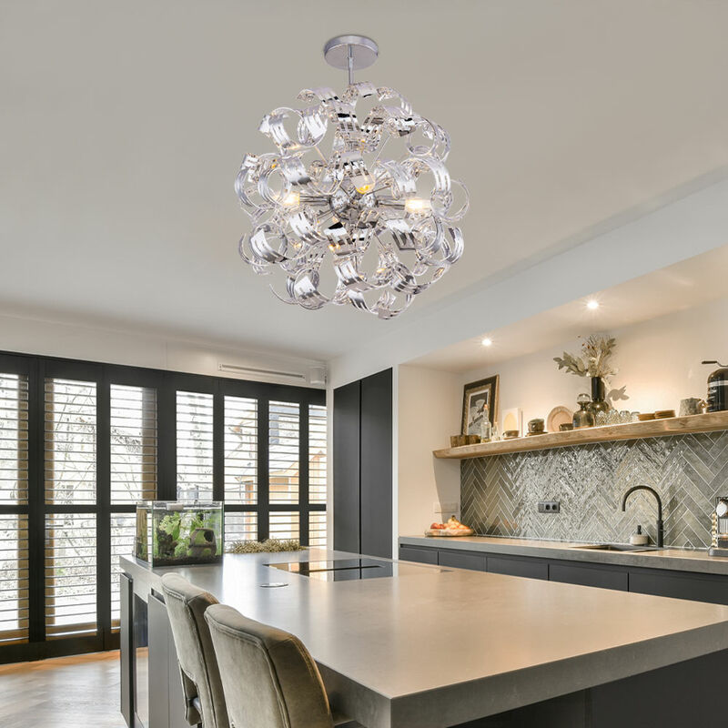 Descrizione Questa lampada da soffitto (Ø 50 cm) offre una meraviglia di romanticismo con i suoi bracci con fasce curve cromate. Con il suo design giocoso e rotondo, questa lampada per interni attira l'attenzione di tutti. Con un'altezza di 56 cm, questa lampada da soffitto può essere utilizzata universalmente all'interno. Scegliendo liberamente la lampada (4 x E14/max. 40W), puoi determinare tu stesso l'intensità della luce e il colore della luce. Con altri modelli di questa serie, puoi migliorare ulteriormente l'immagine del tuo spazio abitativo. Le lampadine non sono incluse nella fornitura. Particolare lampada • Tipo di lampada: plafoniera • Materiale: acrilico, cromo • Colore: cromo • 4 fiamme • Grado di protezione: IP20 • Classe di protezione: 1 • Diametro x altezza in cm: 50x56 • Presa: 4x E14 • Lampadina inclusa: no • Potenza della lampada: massimo 4x 40 watt • Tensione: 230 volt
