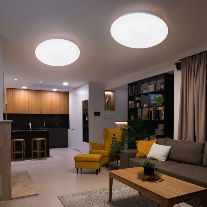 Descrizione Elegante plafoniera con un bellissimo effetto cielo stellato. Questa lampada colpisce per la sua eleganza e il design accattivante. Il paralume in plastica di alta qualità con effetto stella scintillante garantisce un'atmosfera armoniosa nelle vostre quattro pareti. Dai un nuovo accento con questa lampada da soffitto! Una lampadina LED è installata in modo permanente nella lampada. Nella consegna sono incluse due luci! Lampada dettagli • Tipo di luce: plafoniera • Materiale: metallo, plastica • Paralume: copertura in plastica con effetto cielo stellato • Colore bianco • Effetto cielo stellato • Grado di protezione: IP20 • Dimensioni PxH in cm: 30x10 • Presa: 1x LED • Lampade installate permanentemente • Potenza lampada: 15 watt • Flusso luminoso: 1200 lumen • Colore luce: bianco neutro • Alimentazione: da 220 a 240 volt, da 50 a 60 Hz Dettagli lampadine • Tipo di lampadina: scheda LED • Flusso luminoso: 1200 lm (senza paralume) • Consumo energetico: 15 kWh/1000h