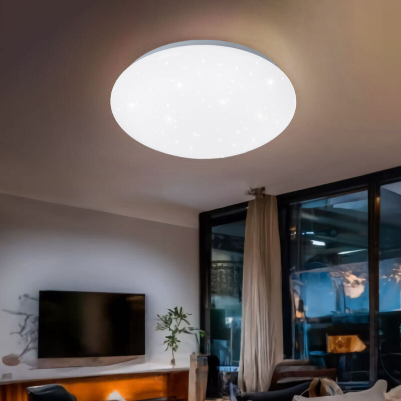 Descrizione Elegante plafoniera con un bellissimo effetto cielo stellato. Questa lampada colpisce per la sua eleganza e il design accattivante. Il paralume in plastica di alta qualità con effetto stella scintillante garantisce un'atmosfera armoniosa nelle vostre quattro mura. Dai un nuovo accento con questa lampada da soffitto! Una lampadina LED è installata in modo permanente nella lampada. Lampada dettagli • Tipo di luce: plafoniera • Materiale: metallo, plastica • Paralume: copertura in plastica con effetto cielo stellato • Colore bianco • Effetto cielo stellato • Grado di protezione: IP20 • Dimensioni PxH in cm: 30x10 • Presa: 1x LED • Lampade installate permanentemente • Potenza lampada: 15 watt • Flusso luminoso: 1200 lumen • Colore luce: bianco neutro • Alimentazione: da 220 a 240 volt, da 50 a 60 Hz Dettagli lampadine • Tipo di lampadina: scheda LED • Flusso luminoso: 1200 lm (senza paralume) • Consumo energetico: 15 kWh/1000h • Temperatura colore: 4000K (Kelvin) • Colore