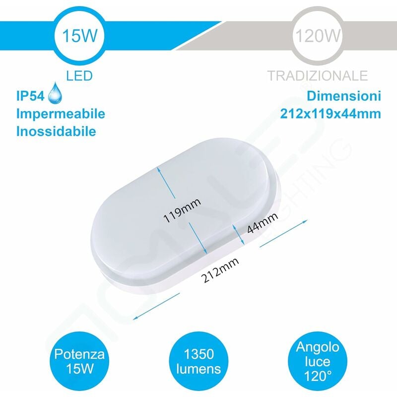 PLAFONIERA LED IMPERMEABILE PER INTERNI E ESTERNI: Plafoniera / Applique Led OVALE 15W luce calda 3000K a basso consumo. Grazie al grado di protezione IP54 resite a spruzzi e umidità. Ideale per illuminare sia interni che esterni: garage, balconi, terrazze, bagni, ripostigli, tavernette. Il fascio luminoso di 120 gradi garantisce un'illuminazione diffusa. USO E INSTALLAZIONE: Plafoniera bianca impermeabile può essere installata sia all'esterno che all'interno. Si fissa facilmente al muro o al soffitto con dei semplici tasselli, e si collegano i cavi nella morsettiera. Non richiede la messa a terra. Il grado di protezione IP54 garantisce la resistenza agli spruzzi, all'umidita, alla nebbia e alla polvere. POTENTE ED ECONOMICA: Plafoniera bianca a led 15W con 1350 lumen, equivalente ad un plafoniera tradizionale da 120W. Permette un risparmio energetico di circa 85%. MATERIALI E DIMENSIONI: La plafoniera / applique è in policarbonato bianco ultra resitente con diffusore opaco.