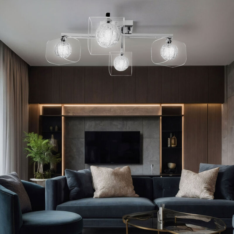 Descrizione Plafoniera di design per il soggiorno. Questa lampada attira davvero l'attenzione e illumina in modo ottimale l'area prescelta. Le lampadine sono incluse nella consegna. Lampada dettagli • Tipo di luce: plafoniera • Materiale: metallo, vetro, alluminio • Colore: cromo, bianco • Grado di protezione: IP20 • 4 fiamme • Lunghezza x larghezza x altezza in cm: 58 x 58 x 16 • Prese: 4x G9 • Le lampadine sono incluse • Potenza della lampada: massimo 4x 42 watt • Alimentazione: 230V, 50Hz Dettagli lampadine • Tipo di lampadina: LED • Flusso luminoso: 630 lm (lumen) • Consumo energetico: 42 kWh/1000 ore • Temperatura colore: 2800 K (Kelvin) • Colore della luce: bianco caldo • Consumo energetico nominale: 42 W (watt) • Voltaggio operativo: 230 V (volt) • Frequenza di rete: 50 Hz (Hertz) • Durata utile nominale: 20.000 ore (ore) • Cicli di commutazione: 15.000x • Contenuto di mercurio: 0 mg (milligrammi) • Dimmerabile: no • Tempo di avvio al 100%