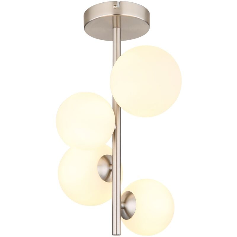 Provate la lampada da soffitto RIHA e aggiungete un tocco di eleganza alla vostra camera. Con il suo metallo nichel opaco e il vetro opalino, questa lampada si fonde armoniosamente in qualsiasi interno. Con una dimensione di 270x230x400mm e un elegante diametro del vetro di 2x10cm e 2x12cm, offre una presenza impressionante. La plafoniera RIHA viene fornita con quattro lampadine a LED G9 a risparmio energetico (3,5 W, 230 V), che offrono un'illuminazione piacevole con una temperatura di colore calda di 3000K con sorgente da 350 lm e uscita di 310 lm. Lasciate che la plafoniera RIHA illumini l'ambiente della vostra camera e incanti i vostri ospiti con il suo design elegante.