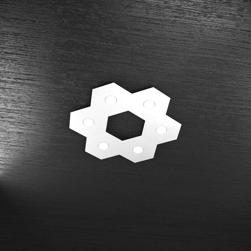 Collezione Hexagon IL FASCINO GEOMETRICO DELL'ILLUMINAZIONE LED Plafoniera 6 luci esagonale formata da lastre quadrate di metallo verniciato in finitura bianca.. I componenti base sono due: uno con sorgente luminosa (1142/1L) e uno solo decorativo (1142/1D). Questi componenti possono essere assemblati fra loro per creare infinite forme e mix di colori. Per comodità vengono proposti alcuni kit precomposti con codice dedicato. La presente collezione in quanto componibile è indicata per risolvere problemi di decentramento tra punto luce e zona da illuminare. Un altro punto di forza del prodotto consiste nel non utilizzare dei led integrati ma una lampadina Gx53 che, una volta montata, arriva a filo della lastra metallica e può essere facilmente sostituita dall'esterno. Esempi di composizioni aggiuntive possibili: I componenti esagonali luminosi (1142/1L) possono essere assemblati fra loro illimitatamente. Le due regole da rispettare sono: 1. Tra due esagoni luminosi (1142/1L) può esserci
