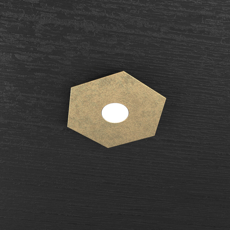 Collezione Hexagon IL FASCINO GEOMETRICO DELL'ILLUMINAZIONE LED Plafoniera 1 luce esagonale formata da lastre quadrate di metallo verniciato in finitura foglia oro.. I componenti base sono due: uno con sorgente luminosa (1142/1L) e uno solo decorativo (1142/1D). Questi componenti possono essere assemblati fra loro per creare infinite forme e mix di colori. Per comodità vengono proposti alcuni kit precomposti con codice dedicato. La presente collezione in quanto componibile è indicata per risolvere problemi di decentramento tra punto luce e zona da illuminare. Un altro punto di forza del prodotto consiste nel non utilizzare dei led integrati ma una lampadina Gx53 che, una volta montata, arriva a filo della lastra metallica e può essere facilmente sostituita dall'esterno. Esempi di composizioni aggiuntive possibili: I componenti esagonali luminosi (1142/1L) possono essere assemblati fra loro illimitatamente. Le due regole da rispettare sono: 1. Tra due esagoni luminosi (1142/1L) può