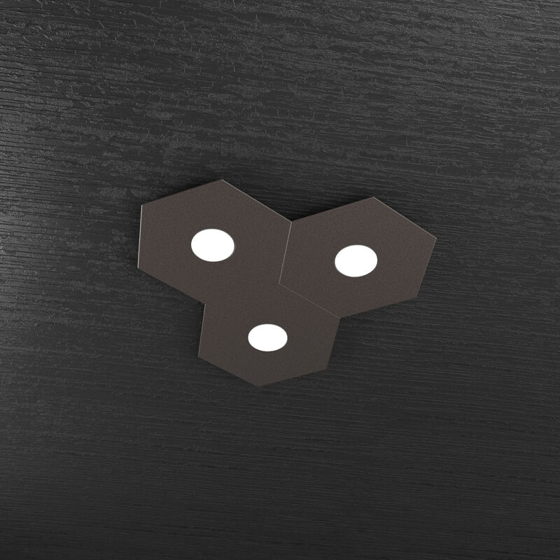 Collezione Hexagon IL FASCINO GEOMETRICO DELL'ILLUMINAZIONE LED Plafoniera 3 luci esagonale formata da lastre quadrate di metallo verniciato in finitura marrone.. I componenti base sono due: uno con sorgente luminosa (1142/1L) e uno solo decorativo (1142/1D). Questi componenti possono essere assemblati fra loro per creare infinite forme e mix di colori. Per comodità vengono proposti alcuni kit precomposti con codice dedicato. La presente collezione in quanto componibile è indicata per risolvere problemi di decentramento tra punto luce e zona da illuminare. Un altro punto di forza del prodotto consiste nel non utilizzare dei led integrati ma una lampadina Gx53 che, una volta montata, arriva a filo della lastra metallica e può essere facilmente sostituita dall'esterno. Esempi di composizioni aggiuntive possibili: I componenti esagonali luminosi (1142/1L) possono essere assemblati fra loro illimitatamente. Le due regole da rispettare sono: 1. Tra due esagoni luminosi (1142/1L) può