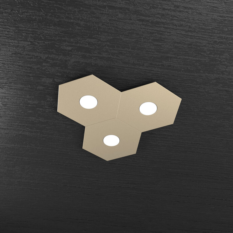 Collezione Hexagon IL FASCINO GEOMETRICO DELL'ILLUMINAZIONE LED Plafoniera 3 luci esagonale formata da lastre quadrate di metallo verniciato in finitura sabbia.. I componenti base sono due: uno con sorgente luminosa (1142/1L) e uno solo decorativo (1142/1D). Questi componenti possono essere assemblati fra loro per creare infinite forme e mix di colori. Per comodità vengono proposti alcuni kit precomposti con codice dedicato. La presente collezione in quanto componibile è indicata per risolvere problemi di decentramento tra punto luce e zona da illuminare. Un altro punto di forza del prodotto consiste nel non utilizzare dei led integrati ma una lampadina Gx53 che, una volta montata, arriva a filo della lastra metallica e può essere facilmente sostituita dall'esterno. Esempi di composizioni aggiuntive possibili: I componenti esagonali luminosi (1142/1L) possono essere assemblati fra loro illimitatamente. Le due regole da rispettare sono: 1. Tra due esagoni luminosi (1142/1L) può esserci