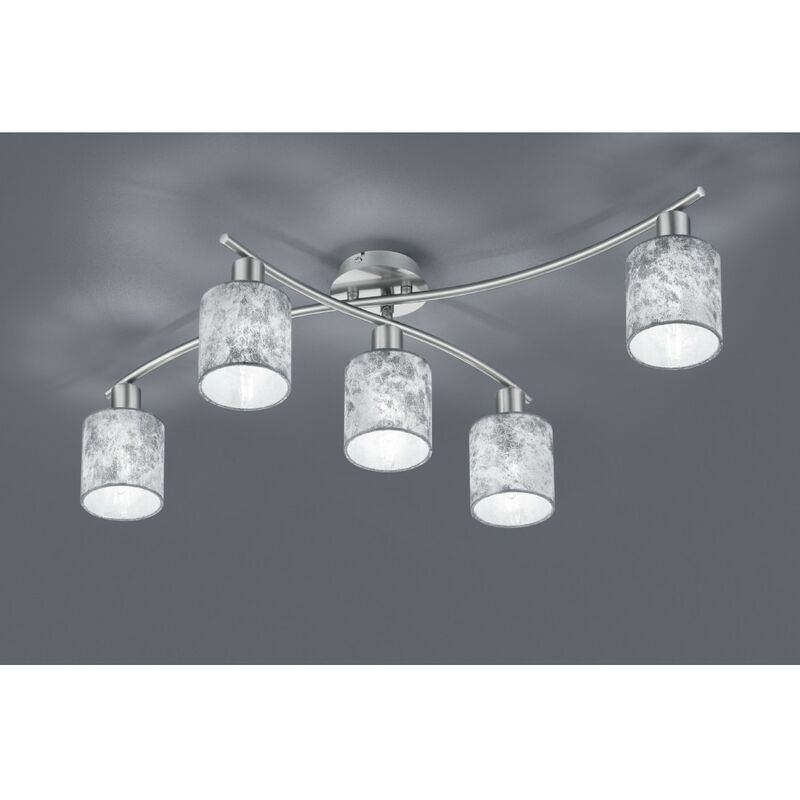 Plafoniera Nichel 5 Paralumi Tessuto Argento L75 cm La lampada da soffitto Garda di Trio Lighting presenta un rosone in metallo, bracci orientabili finitura nichel opaco e 5 paralumi in tessuto color argento. Dotata di 5 alloggi per lampadine E14 max 25 watt (acquistabili separatamente). Un elemento dallo stile semplice ed elegante, perfetto per arredare ed illuminare con raffinatezza diversi ambienti della vostra casa, come ad esempio la zona living, il salone o la camera da letto. Caratteristiche: Rosone in metallo Bracci orientabili finitura nichel opaco 5 paralumi in tessuto color argento 5 alloggi per lampadine E14 max 25 watt (acquistabili separatamente) Disponibili anche le varianti di finitura.