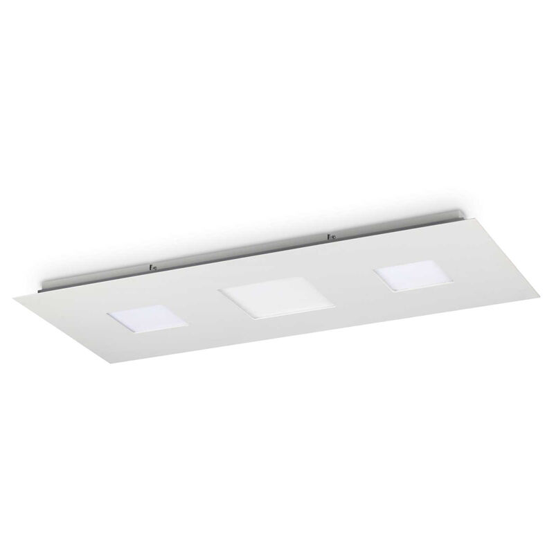 Collezione RELAX PER UNA VASTA DIFFUSIONE DELLA LUCE Plafoniera rettangolare 90x40 cm. Montatura in metallo rifinito con vernice opaca bianca. Diffusori in policarbonato opale. Doppia emissione luminosa: principale e laterale. Sorgente LED sostituibile tonalità 3000 K nuance calda. Lampada con dimmer.