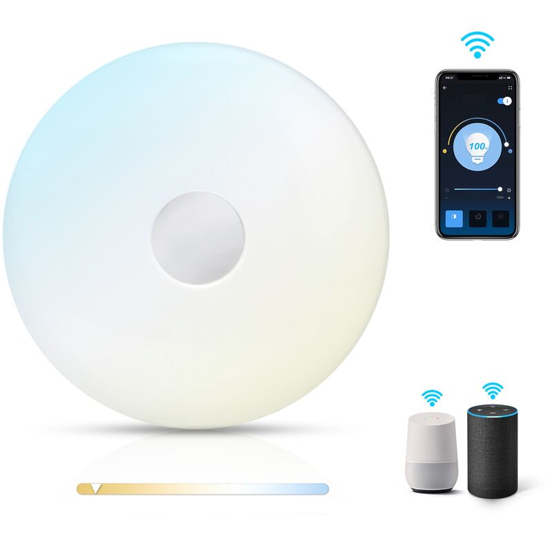 PLAFONIERA A LED SMART 18W WIFI ALEXA E GOOGLE HOME 3000K-6500K Massima potenza:18W Flusso luminoso:1300lm CCT:3000-6500K Voltaggio:220-240V~ Modalità di configurazione Wi-Fi:Configurazione della rete WIFI Intensità corrente:150mA Frequenza:50/60Hz CRI:Ra>80 FP:>0.5 Angolo di illuminazione:120° Hg%:0 0 0 0 0 Consumo di energia per 1.000 ore:18kwh/1000h EEI:A Tipologia:Plafoniere smart Dimensioni:D340*H80mm Colore della luce:Da calda a fredda Colore:Bianco Modello:Rotondo Ambiente:Interno Temperatura:-20℃~40℃ Durata:25000h N. test interruttore:15000times Materiali principali:Acciaio & PMMA