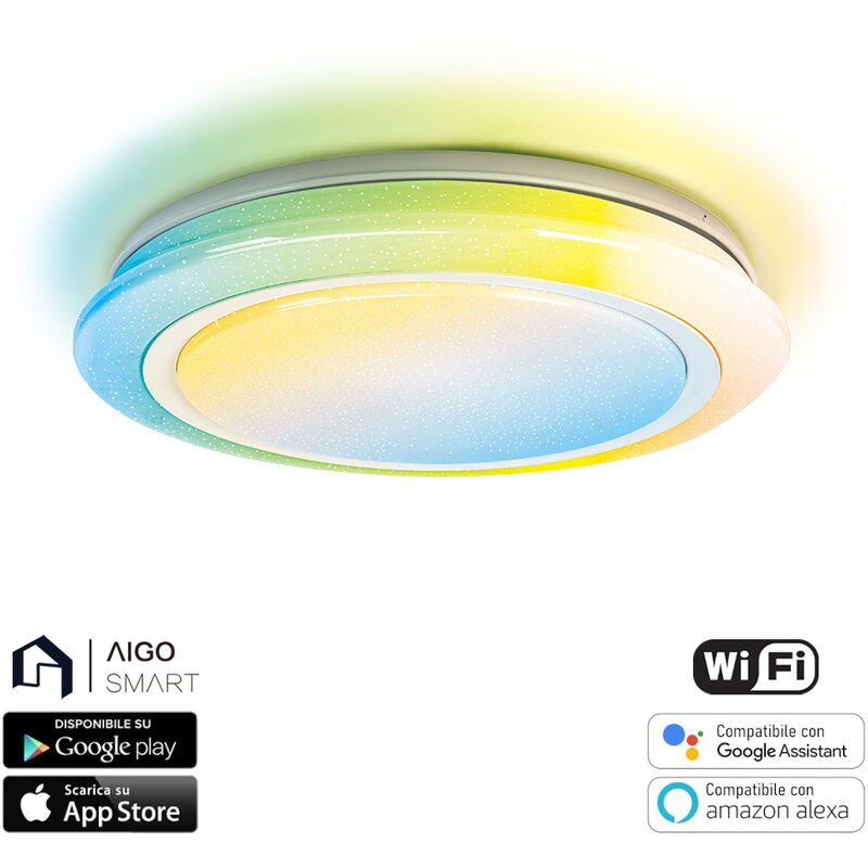 Benvenuti nel futuro dell'illuminazione domestica! La plafoniera led Smart da 24W per la luce bianca CCT e 3W per la luce RGB è l'accessorio perfetto per portare eleganza e intelligenza nella tua casa. Con una connessione Wi-Fi, hai il controllo totale della tua illuminazione. Scegli tra il comfort del bianco caldo e l'energia del bianco freddo, oppure crea atmosfere uniche con una gamma di colori vivaci grazie alla modalità RGB.Immagina di poter controllare l'illuminazione della tua casa con un semplice comando vocale o un tocco sul tuo smartphone. La plafoniera led Smart è completamente compatibile con gli assistenti vocali Amazon Alexa e Google Home. Basta dire Accendi la luce per creare l'atmosfera desiderata. Inoltre, grazie all'app AigoSmart, hai il controllo completo della luce, ovunque tu sia. Illumina la tua casa prima di rientrare o personalizza l'atmosfera senza alzarti dal divano. Inoltre hai la possibilità di utilizzare la modalità musicale, lasciando che la luce vada a