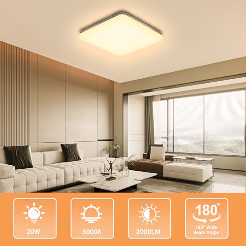 ALTA LUMINOSITÀ E RISPARMIARE ENERGETICO: Plafoniera LED soffitto quadrata 20W può generare 2000 Lumen, luce bianco caldo 3000K. L'angolo di emissione della luce è di 180 °, nessuna radiazione e nessuna strobo. Maschera ad alta trasmissione luminosa, fornendo un'illuminazione sufficiente per ogni stanza. Lampada da soffitto corrisponde a una lampadina a incandescenza convenzionale da 150W e consente di risparmiare oltre l'87% sui costi dell'elettricità!