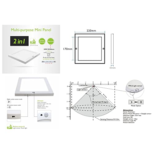 Lampada da soffitto con pannello a LED da 230 V, con rilevatore di movimento e sensore crepuscolare, 18 Watt, 1300 lumen (bianco caldo), 1500 lumen (colore bianco diurno).