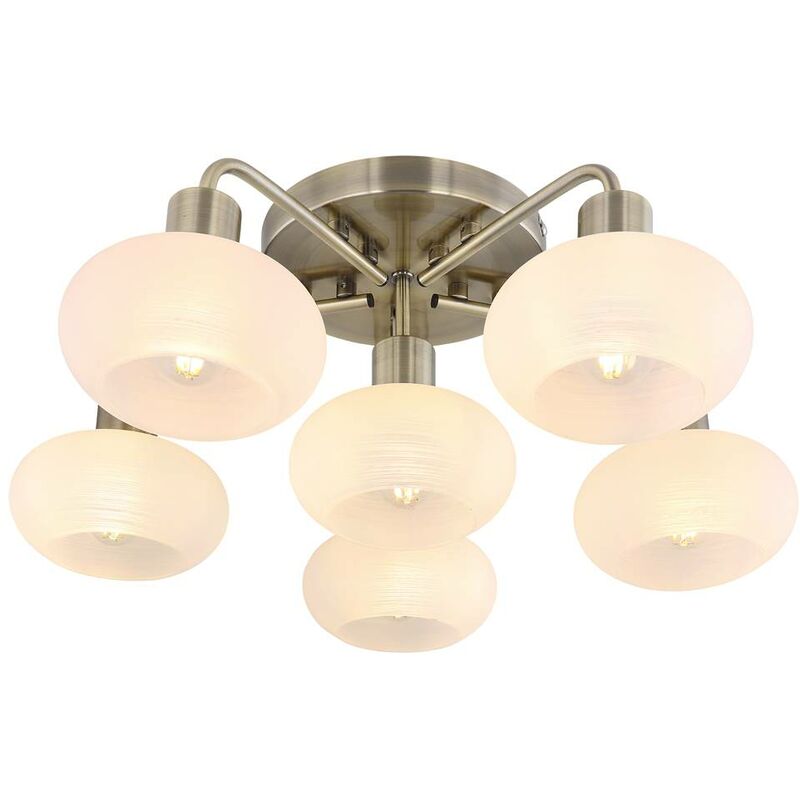 Lampada del soffitto Sorina Antique Ottone Bianco E14 6X MAX 40W H: 20,5 cm Ø48,5 cm Dimmabile Dimensioni in mm: Altezza: 205, diametro: 485 Peso in kg: 2,55 estratto in mm: 180 Tipo di agente luminato/versione: E14 Gli illuminanti contengono: No Prestazioni massime in Watt: E14 6x 40W Tipo di protezione: ip20 Dimmbar: Sì Switch: No Materiale dell'alloggiamento: metallo Colore abitativo: Brass antik Materiale vetro/picchi: vetro Colore vetro/ombrello: bianco