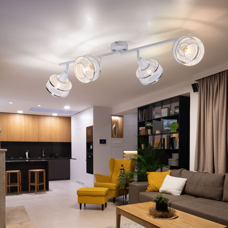 Dettagli • faretto metallo bianco • anello cromato • mobile • LxPxH: 680x120x215 • escl. 4xE14 40W 230V • materiale: metallo bianco • paralume: metallo bianco, Anello cromato • color: bianco • color paralume: bianco • dimensioni AxLxP in cm: 21,5x12x68 • numero di prese: 4 • base: E14 • output max .: 40W (Watt) • Voltaggio: 230V (Volt) • Lampadine incluse: no