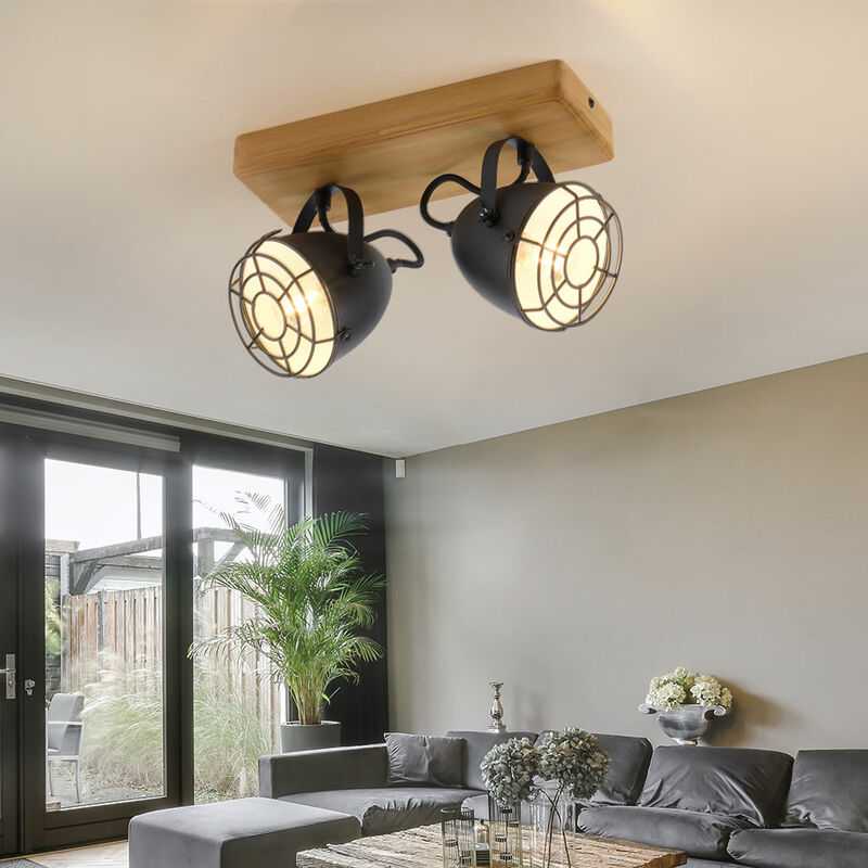 Descrizione La plafoniera con il supporto da parete in legno e i due paralumi con la gabbia in metallo ha un aspetto rustico, ma comunque moderno. Il look può quindi essere combinato bene con lo stile vintage o industriale. Le tonalità nere con le coperture realizzate con sottili montanti in metallo si trovano su una staffa rettangolare a soffitto in legno e completano così il design. Le teste della lampada possono essere ruotate per garantire un'illuminazione basata sulle esigenze. La plafoniera deve essere dotata di due lampadine E14 con un massimo di 10 watt. Poiché la vista delle lampadine è chiara, si consiglia di utilizzare lampadine a incandescenza. Le lampadine non sono incluse! dettagli • Tipo di lampada: plafoniera • Materiale: metallo, legno • Colore: nero, marrone • Grado di protezione: IP20 • Classe di protezione: 1 • Spot mobili • Lunghezza x larghezza x altezza in cm: 30,5 x 17 x 20 • Prese: 2x E14 • Lampadina inclusa: No • Potenza della lampada: 2x massimo 10 watt