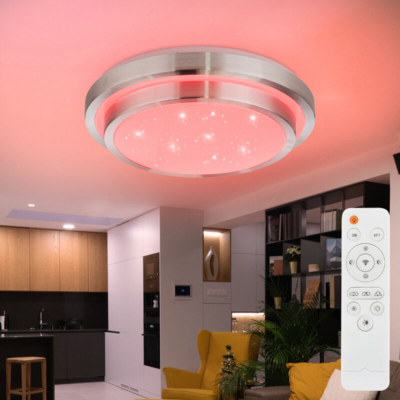 Descrizione Elegante plafoniera LED RGB con ottica cielo stellato Questa luce attira davvero l'attenzione grazie i numerosi elementi traslucidi I punti nel paralume creano un gioco di luci che sembra come se le stelle stessero scintillando. Puoi usare il telecomando in dotazione per cambiare su una funzione di cambio colore in modo che venga riprodotto un bellissimo gioco di luce, i colori siano fissi e la temperatura del colore sia attenuata / impostata (da bianco caldo a luce diurna). Rispetto alle luci normali, i faretti a LED consumano una quantità minima di elettricità e sono consumi ancora più bassi rispetto alle luci a risparmio energetico. Questo fa bene all'ambiente e al tuo portafoglio. La sorgente luminosa a LED è già installata in modo permanente nell'apparecchio. Dettagli lampada • tipo di lampada: plafoniera • struttura: metallo, alluminio • paralume: acrilico, bianco opale (molti piccoli punti traslucidi) • telecomando • Simbolo WLAN: per l'apprendimento nell'FB se