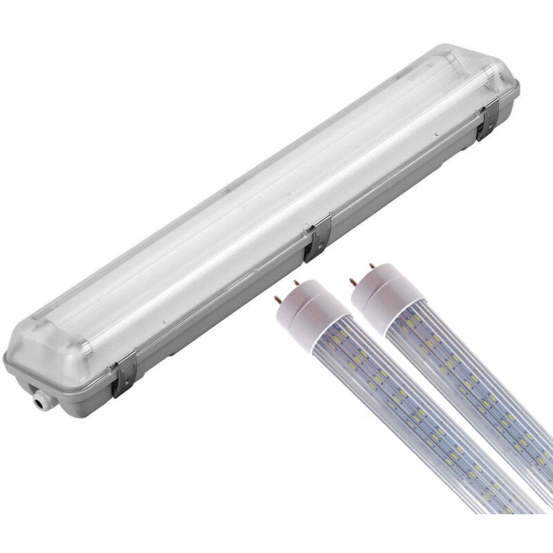 Plafoniera a tenuta stagna ip65 120cm 220v incluso di 2 tubi t8 20w La plafoniera stagna codice P12 con CONNESSIONE BILATERALE ospita 2 tubi LED con attacco T8 da 120 cm (inclusi). Grazie al suo indice di protezione IP65 può essere installato anche in esterno, mantenendo protetti da umidità e intemperie i tubi led al suo interno. Il prodotto può essere installato a soffitto o parete grazie agli accessori di fissaggio inclusi. La plafoniera è inclusa i due TUBI LED T8 codice TUBOT8LED-20W Caratteristiche tecniche: Marchio Potenza 2x 20W = 40W Tensione di funzionamento 220-240v AC 50-60 HZ (CONNESSIONE BILATERALE) Tecnologia LED Intensità luminosa 3600 lumens Temperatura luce scegliere la tonalità di luce tra quelle disponibili Fascio di luce 120° Indice di protezione IP65 (adatta anche per esterno) Tipo di installazione da applique su parete/soffitto Materiali PVC e lega di alluminio Colore (finitura) Grigio Diffusore Policarbonato opaco Durata media > 20 000 h Certificazioni CE e Rohs