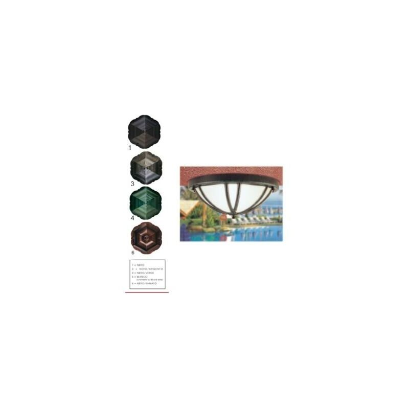 Plafoniera per esterno, a forma circolare, con struttura in alluminio verniciato nero oro e diffusore in policarbonato opalino;