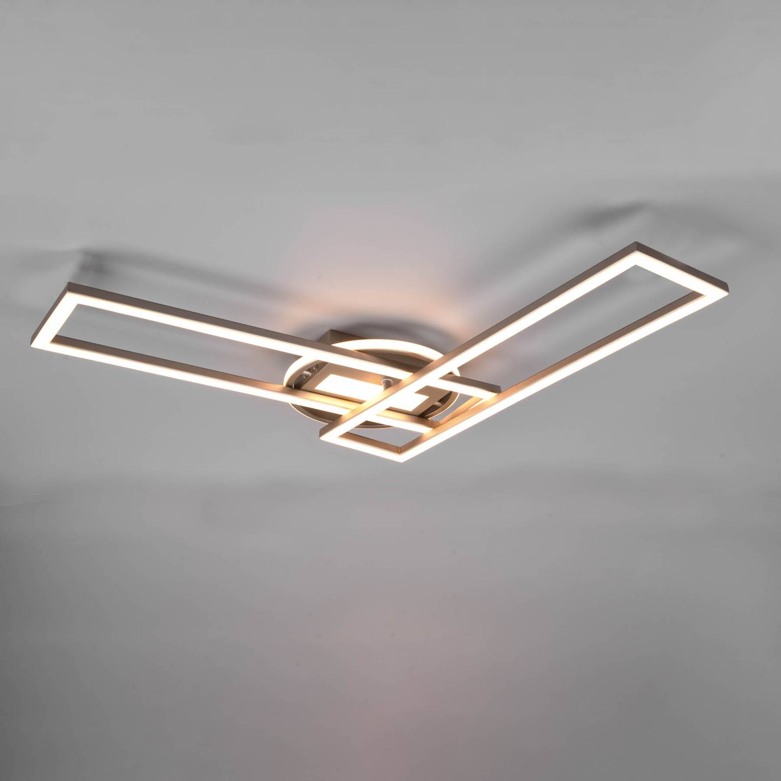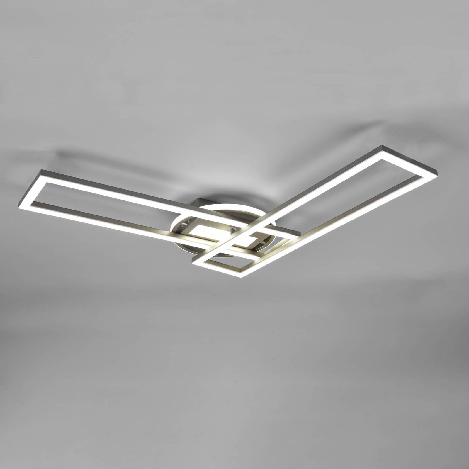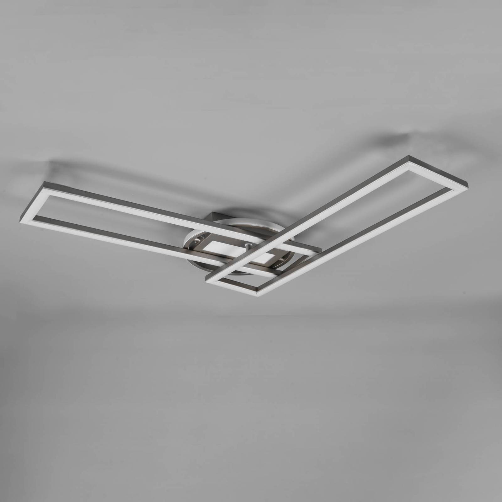 Plafoniera LED Twister funzionale con luminosità e colore della luce regolabili La plafoniera LED Twister è composta da quattro sezioni con LED integrati: un rettangolo sotto la calotta, un anello che la circonda e due cornici rettangolari. Il telaio inferiore può essere ruotato orizzontalmente, in modo da poter sempre adattare il design della plafoniera Twister. Quest'ultimo aspetto riguarda anche la luce: Twister può essere dimmerato e il colore della luce può essere regolato da bianco caldo a luce diurna tramite il telecomando in dotazione, in modo da avere la giusta illuminazione per quasi tutte le situazioni. Dopo la riaccensione, viene riattivata l'ultima impostazione selezionata. La regolazione della luminosità in tre livelli (100 %, 50 %, 25 %) è possibile anche tramite un interruttore a parete convenzionale.