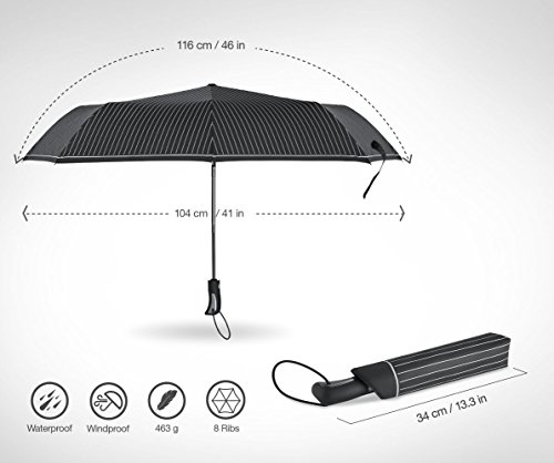 PLEMO Ombrello Pieghevole Automatico, Antivento da Pioggia per Donna Uomo, Tascabile da Viaggio (Nero Strisce Bianche)