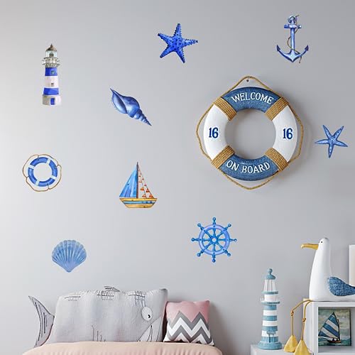 PLIGREAT Adesivi murali a tema oceano blu nautico, adesivo murale rimovibile in vinile conchiglia stella marina per la decorazione murale del soggiorno della camera da letto della scuola materna