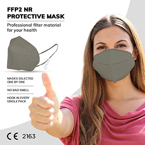 PLUS Mascherine FFP2 Grigio con Elastici Comodi, Nasello regolabile, Antipolvere e polline, Interno Bianco, Certificate CE 2163 con Gancio Incluso, Confezione da 20 Pezzi