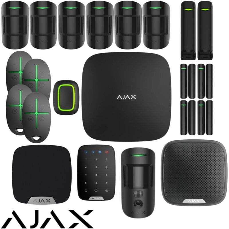 This KIT can be shipped only by DPD outside Italy AJAX KIT 22 PEZZI CONTENENTE: 1x Centralina AJAX HUB 2 PLUS NERO 1x Tastiera numerica AJAX KEYPAD NERO 1x Allarme da interno AJAX HOMESIREN NERO 1x Allarme da esterno AJAX STREETSIREN NERO 1x Pulsante Anti Panico AJAX PANIC BUTTON NERO 1x Rilevatore di movimento con telecamera AJAX MOTIONCAM NERO 2x Rilevatori di movimento a fascio stretto AJAX MOTIONPROTECT CURTAIN NERO 4x Telecomandi AJAX SPACECONTROL NERO 4x Contatti magnetici AJAX DOORPROTECT NERO 6x Rilevatori di movimento da interno AJAX MOTIONPROTECT NERO