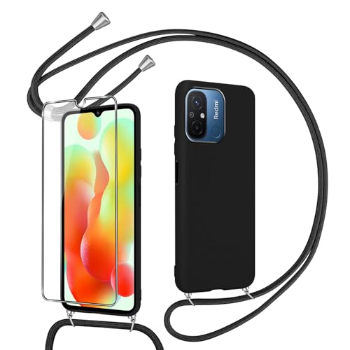 Pnakqil Cordino Collana Cover per Xiaomi Redmi 12C, con 1 Pezzi Vetro Temperato Pellicola Prottetiva, Tracolla Custodia Case in Silicone Smerigliato per Redmi 12C, Nero