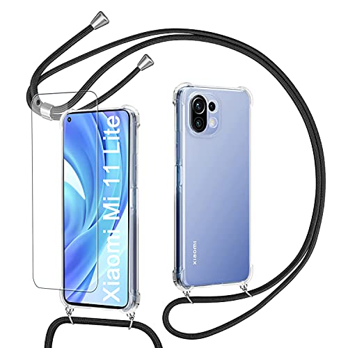 Pnakqil Custodia con Cordino Cover per Xiaomi Mi 11 Lite 4G/5G 6.55" + 1x Vetro Temperato Pellicola Protettiva Girocollo Collana Collo Custodie a tracolla cordini Catena Case Per Xiaomi 11 Lite,Nero