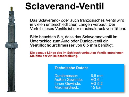Informazioni sulla valvola: SV 42 mm Sclaverand (valvola francese) lunghezza: 42 mm, foro valvola: 6,50 mm, portata massima della valvola: 15 bar. Denominazioni alternative: valvola Presta, valvola francese, valvola per bici da corsa, valvola pneumatica, valvola Presta. Un tappo per valvola adatto alla valvola è incluso.