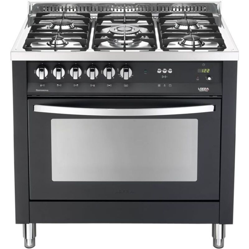 Piano cottura - finitura acciaio inox lucidato a specchio - 5 fuochi a gas valvolati III Serie di cui 1 tripla corona - accensione elettronica integrata alla manopola - protezione totale Gas-Stop - griglie in ghisa Forno - multifunzione elettrico a 9 programmi - capacità 94 lt - grill elettrico - programmatore elettronico digitale - porta con 3 vetri di cui 2 riflettenti per una minore dispersione di calore - vetri interni della porta asportabili per facilitarne la pulizia - guide forno estraibili - ventola tangenziale per raffreddamento cruscotto - piedini regolabili in altezza e in profondità Lofra PNMG96MFT/C. Tipo di prodotto: Piano cottura, Colore del prodotto: Nero, Tipo di controllo: Manopola. Tipo di piano cottura: Gas, Numero totale elementi piano cottura: 5 Fornello(i), Tipo di superficie superiore: Acciaio inossidabile. Dimensione del forno: Largo, Sorgente di alimentazione del forno: Elettrico, Capacità netta del forno: 94 L. Tipo di timer: Digitale. Classe efficienza