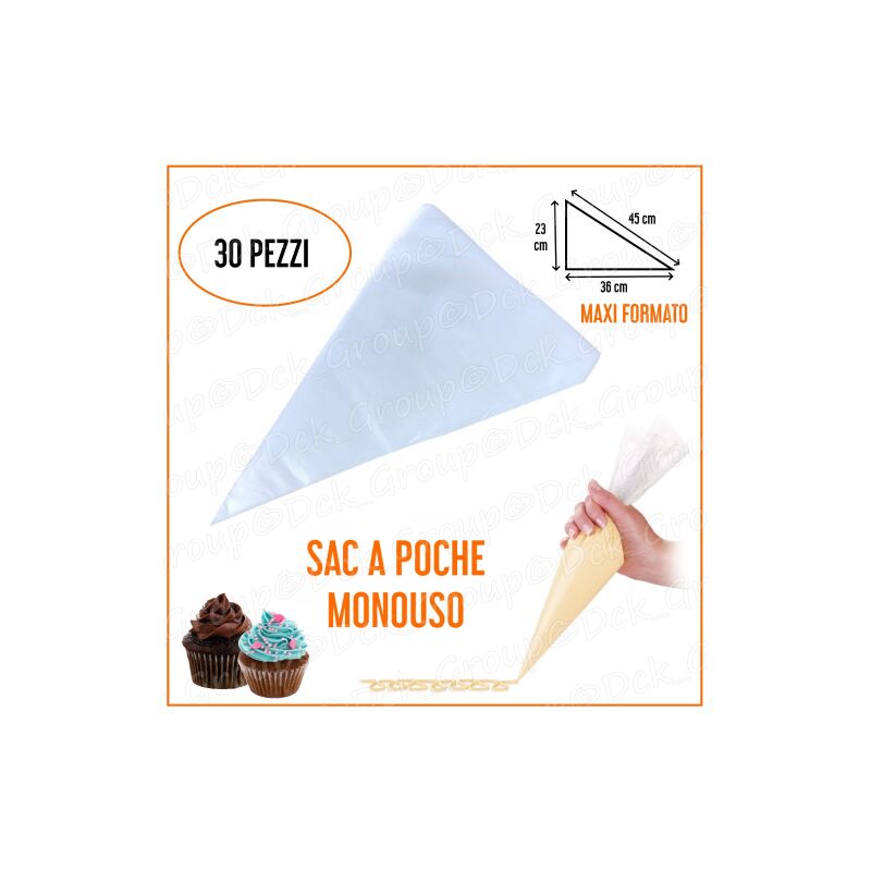 Sac a' Poche Monouso - confezione in sacchetto da 30 pezzi Formato Extra Large: cm 36 x 23 x 45 Ideali per decorazioni in pasticceria, cake design, frosting, decorazioni di cupcake Puo' essere usato con o senza ugelli: basta tagliare l'estremita' della borsa alla dimensione desiderata.
