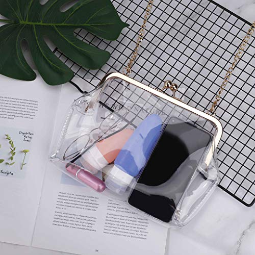 Design accattivante: l'elegante borsa della frizione è realizzata in resistente tessuto di PVC trasparente, una sensazione di tocco molto confortevole e la catena superiore a spalla in oro di alta qualità con chiusura Kisslock soddisfa i requisiti della borsa di sicurezza pubblica.
