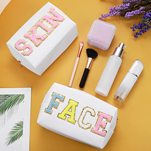【Design Preppy】La borsa cosmetica dell'alfabeto è decorata con toppe con lettere in ciniglia e finiture dorate, colore di base bianco morbido con rosa e oro, carino e carino, comodo per mettere gli oggetti corrispondenti e decorare bene la custodia