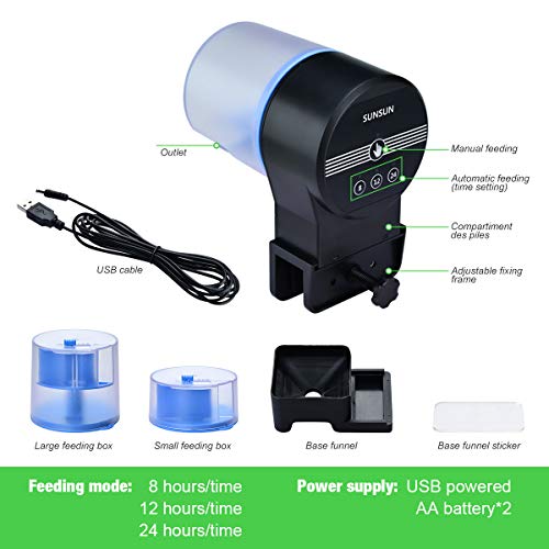 UTILIZZO FACILE: l'esclusivo design chiuso e la struttura dell'apertura del mangime sulla parte superiore per evitare che il cibo venga idratato o intasato nel distributore, così come è conveniente aggiungere mangime senza rimuovere il contenitore di alimentazione. È possibile controllare facilmente la quantità di cibo per pesci erogata regolando il cursore.
