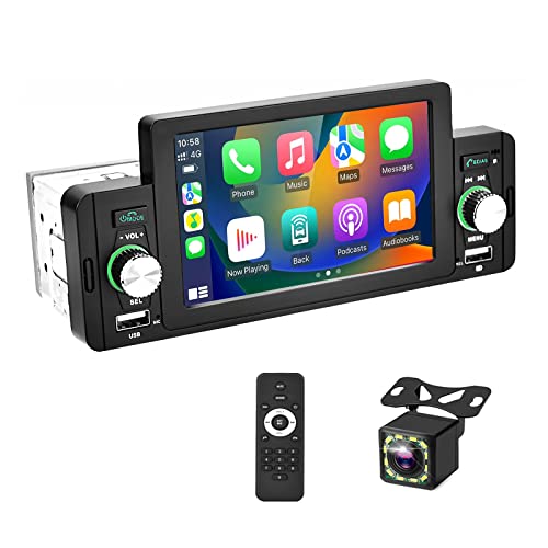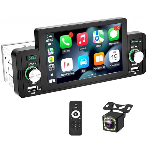 Podofo Autoradio 1 Din con Wireless Apple Carplay Bluetooth Android Auto, Autoradio da 5 Pollici con Display, Supporto FM, Mirror Link, Ricarica Rapida + Telecamera Posteriore e Microfono