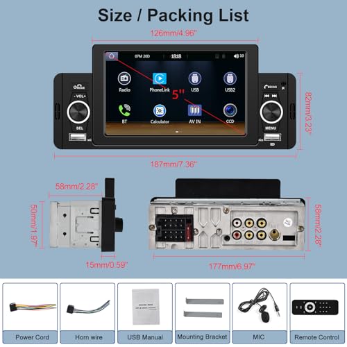 【Autoradio 1 Din con touchscreen da 5 pollici】Dimensioni DIN singolo standard: 187 (larghezza) x58 (altezza) mm. Touchscreen da 5 pollici, display HD 800 * 480, risposta sensibile a ogni tocco. Conferma se blocca il cruscotto prima dell'acquisto .
