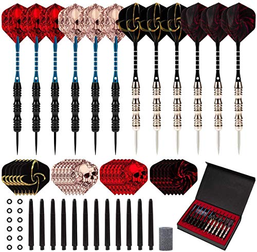 POFET - Set di 12 freccette con punta in acciaio da 22 g, con fusto in ferro antiscivolo, in alluminio e 4 alette in stile con confezione regalo