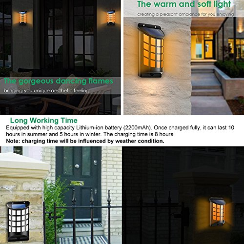 PoFo Applique solari impermeabili e wireless, luci a fiamma lampeggiante con 66 LED, accensione / spegnimento automatici per decorazione di patio, recinzione, patio, porta e festival