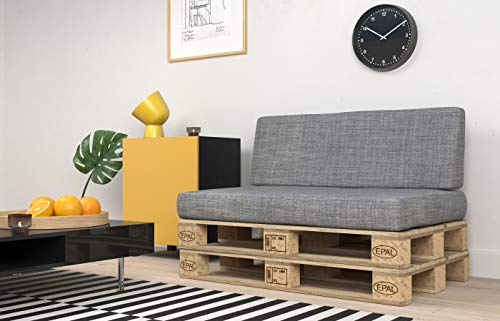 Set da 2 pezzi: Cuscino-sedile 120x80cm + 2x Cuscino-schienale 120x40cm. Set di cuscini, comodi sedili e schienali compatibili con i europallet. Grazie a questi cuscini puoi trasformare l'europallet in un comodo mobile. Acquistando i cuscini, i pallet non sono inclusi.