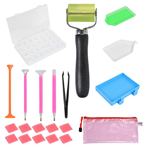 POKIENE Kit di Accessori per Pittura con Diamante 21pezzi, con Penna Adesiva Diamantata, Scatola per Pittura con Diamante, Pinzette, Custodia con Cerniera, Rullo e Piastra Diamantata