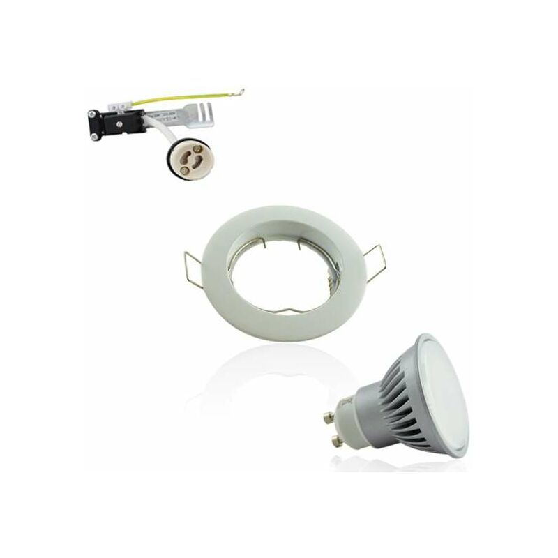 Kit spot LED GU10 con una potenza di illuminazione 7W 60W. Questo kit all-in-one comprende: un supporto spot fisso rotondo bianco da incasso + una presa in ceramica GU10 + una lampadina LED GU10 7W ad alta luce 60W in bianco naturale 4200K. Diametro di perforazione 62 mm, diametro esterno 76mm, altezza totale 60mm. 4200K 7W 60W 550 120° Un completo kit GU10 Questo set include uno spot GU10 7W ampio angolo di illuminazione 60W classificato come categoria energetica A+. Il bulbo è associato a una presa in ceramica bianca GU10 che consente il collegamento diretto alla rete di alimentazione 220V e un supporto spot da incasso rotondo per incassare la lampadina nel soffitto. Imballaggio: Kit tutto compreso Consumo di watt: 7 W Materiale: Alluminio Indice di protezione IP: IP20 Colore: Bianco Modulo: Rotondo Attacco: GU10 Flusso luminoso (lumen): 550lm Angolo di illuminazione: 120° Durata di vita: 20000h Watt equivalenti: 60 W Tipo di LED: SMD Diffusore: Satinato IRC CRI: ≥80