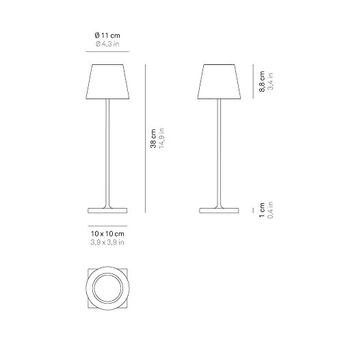 temperatura di colore della luce tra 2700K e 3000K (bianco dinamico). Dimensioni Lampada: 11x11x38 cm, 100-240V 50-60Hz 5Vdc max 1A, pacco batteria al litio ricaricabile e sostituibile. Inclusi: Lampada, Base di Ricarica a contatto, Alimentatore plug EU con 1 Porta USB