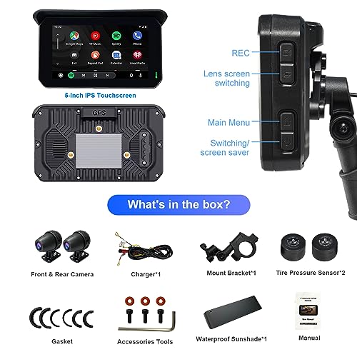 5 pollici portatile CarPlay per moto, Display Touchscreen GPS Navigation Android Auto, IPX7 impermeabile moto CarPlay schermo con telecamere anteriori e posteriori, sensore pressione pneumatici
