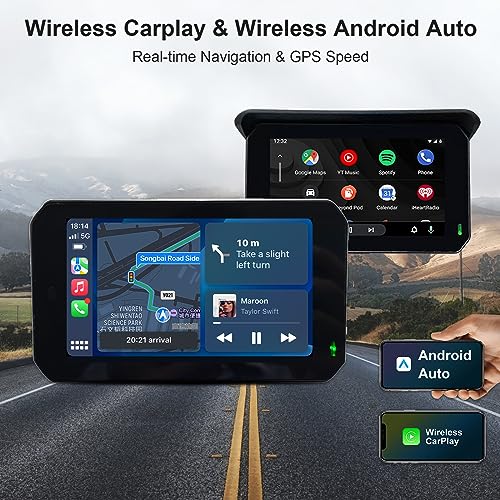 Touchscreen portatile per motocicli: Touchscreen portatile per motocicli FHD da 5 pollici con Apple Carplay integrato e Android Car che consente di visualizzare i percorsi di navigazione in modo più chiaro durante la guida.