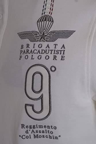 Polo uomo ufficiale Esercito Italiano con mezza manica piquet di cotone, con colletto a costina e fessino costruito, bottoni personalizzati, spacchetti laterali con fettuccia di cotone a contrasto colore. Ricami a petto Brigata Paracadutisti Folgore e impuntura tricolore. Patch con stelletta in brunito su manica sinistra.