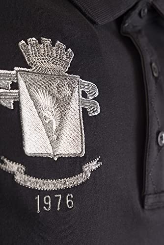 Polo uomo ufficiale Esercito Italiano con mezza manica in jersey di cotone, con colletto a costina e fessino costruito, bottoni personalizzati, spacchetti laterali con fettuccia di cotone in tinta. Dettagli a contrasto in canvas e ricami Aviazione Esercito. Patch con stelletta in brunito su manica sinistra.