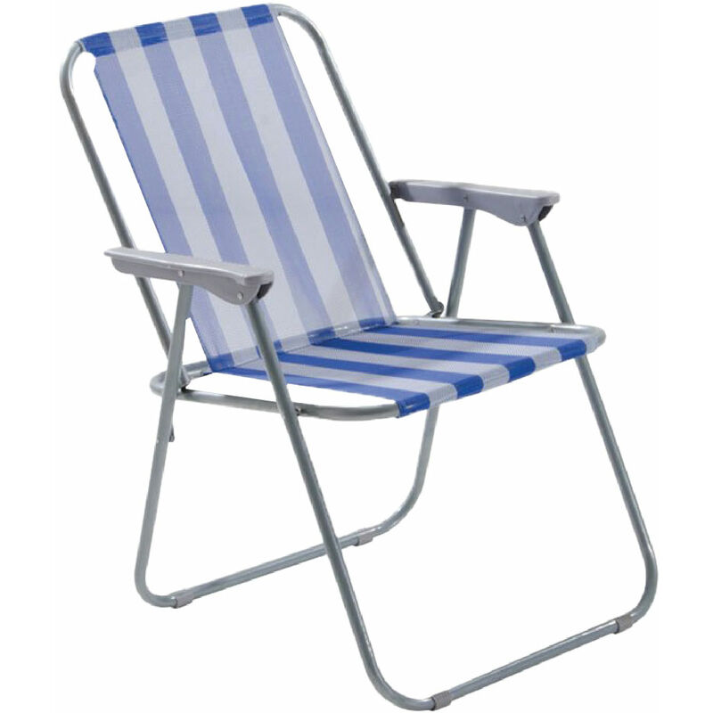 Struttura in acciaio verniciato, braccioli realizzati in plastica, tubolari da +â-£ cm 1,8. tessuto in poliestere colorato, portata max 110 kg. dimensioni: 52x44xh.75.telo bianco/blu